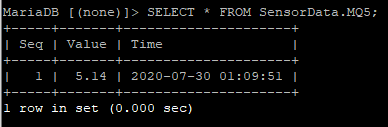 DHT11 테이블과 MQ5 테이블을 조회해본 결과 위의 시리얼 모니터에 출력된 값과 시간이 모두 잘 나온다.