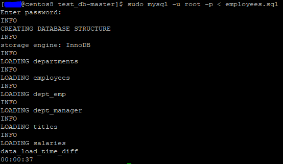 이후 코드가 있는 폴더로 change directory 하여 해당 위치에서 mysql root계정으로 employees.sql파일을 실행한다.