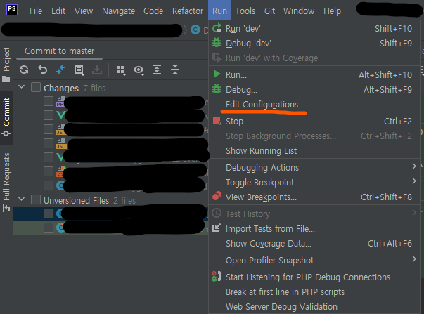1. PhpStorm에서 Run > Edit Configurations를 선택합니다.