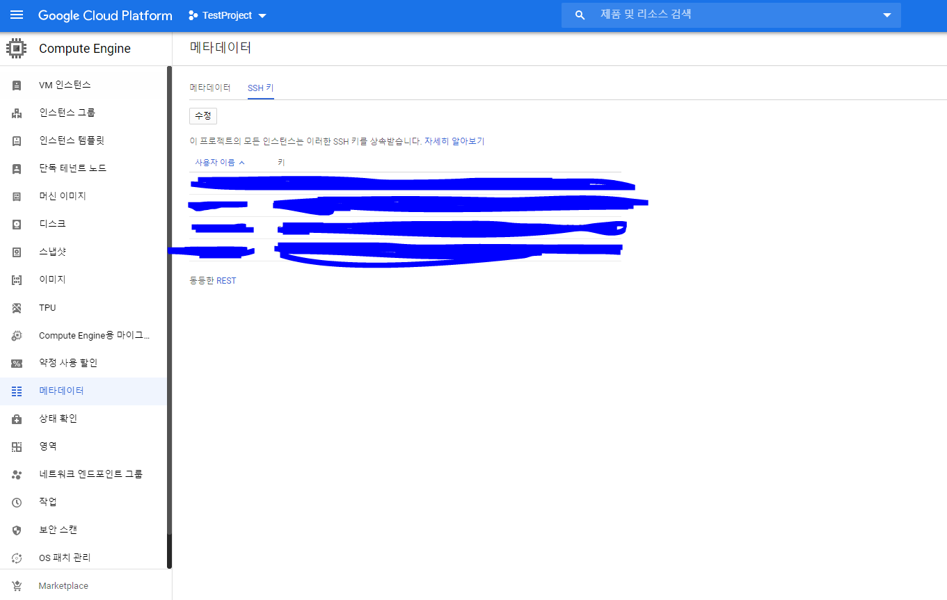 key 저장이 완료되면 다시 Google Cloud Platform으로 돌아와서 메타데이터를 선택한다.