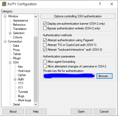 그리고 맨 밑의 Private key file for authentication 파일 선택부분에서 아까 puttygen에서 생성된 key파일을 불러온다.
