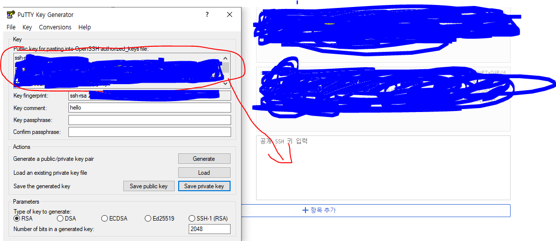 앞서 puttygen프로그램에서 생성된 key 값을 복사하여 해당 입력창에 붙여넣는다.