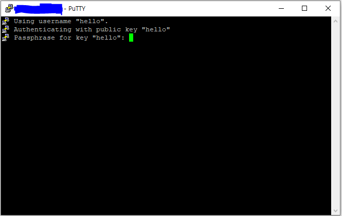 나는 puttygen을 통해 key생성시 passphrase를 생성했으므로 접속과정에서 passphrase를 묻는 과정이 나온다.