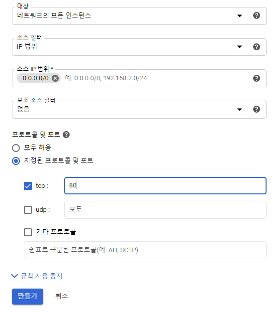 설정은 다음과같이 해준뒤에 방화벽 규칙을 만들어준다.