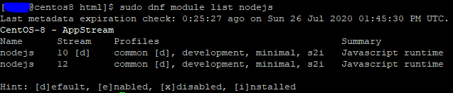 설치방법은 CentOS AppStream을 통한 방법, Node Version Manager를 이용한 방법, NodeJS 공식 홈페이지에서 직접 소스를 받아 설치하는 방법이 있다. 여기서는 AppStream을 통한 방법으로 설치를 진행한다.