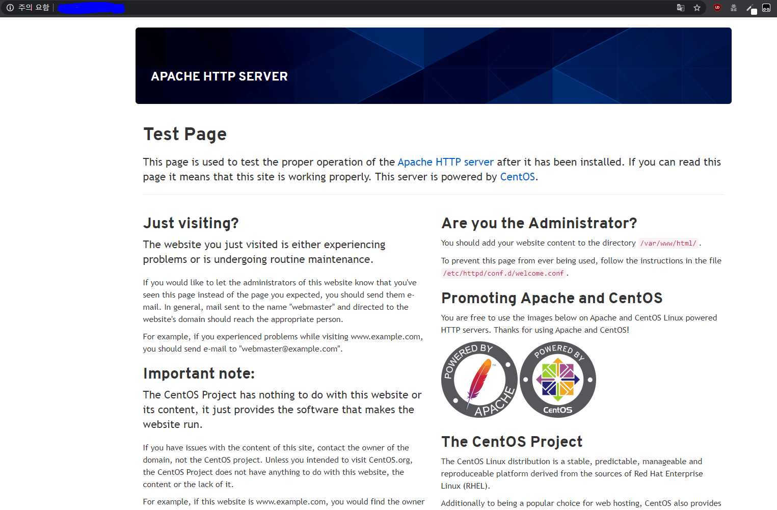 Apache설치시 나오는 테스트 페이지가 잘보인다.